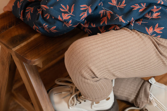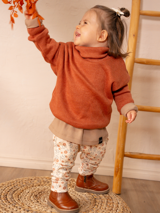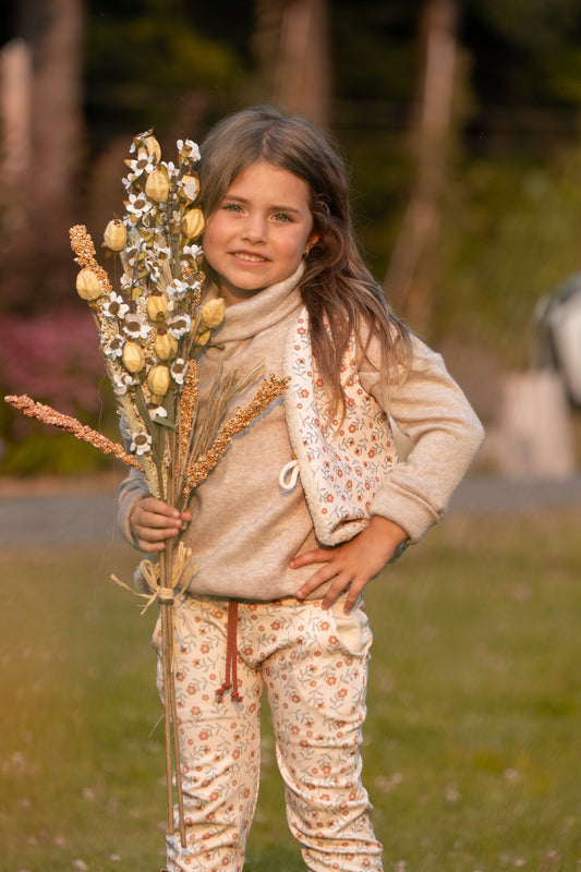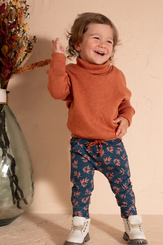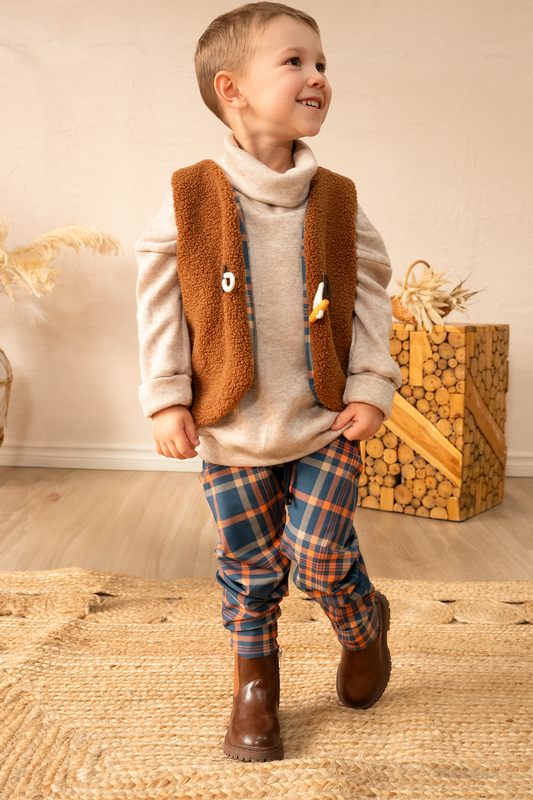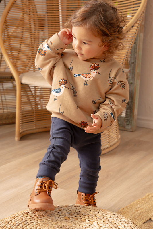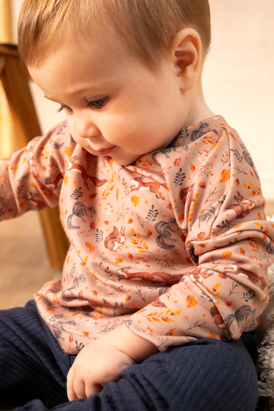 After Wildflower , the stroll continues beneath the tall trees. Wildwood is an invitation to explore the forest, its deep colors and hidden treasures. Small animal motifs, delicate foliage and wood-inspired details gently tell the story of wildlife. Autumnal hues – midnight blue, burnt orange, earthy brown and soothing beige – blend with comforting materials to dress little explorers with authenticity and poetry. A collection that breathes nature, designed to last and accompany each season.