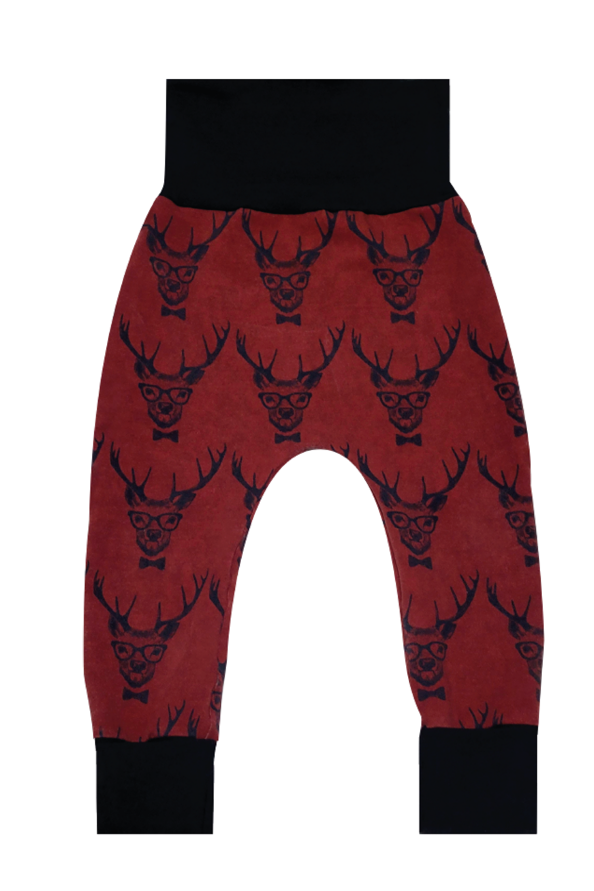 Unisex evolving pants; burgundy deer print. A harem pants cut with adjustable scalable bands at the waist and ankles. A loose fit perfect for layers or even without layers. Give your mini a casual style that will allow it to move easily.