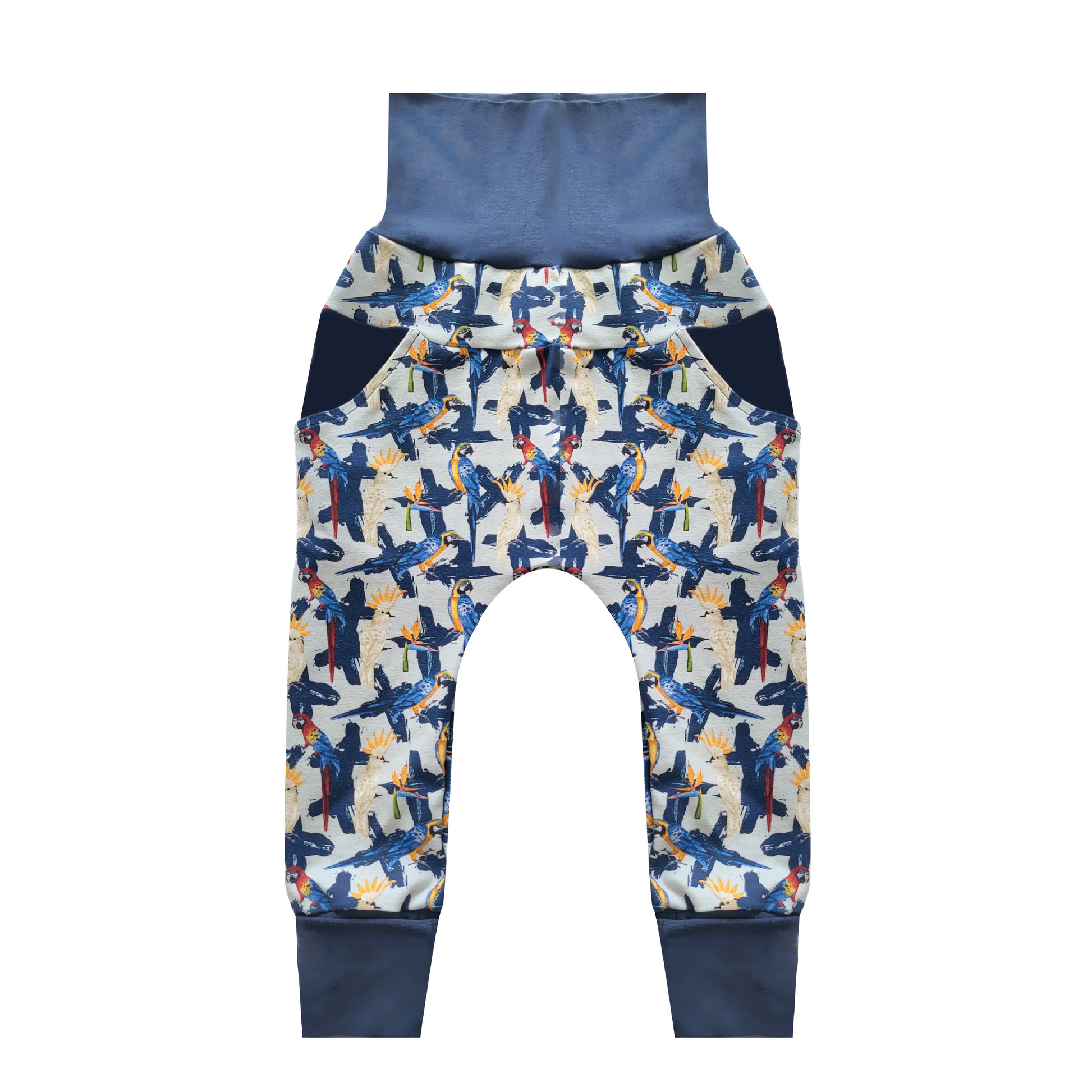 Harem cut pants with adjustable scalable bands at the waist and ankles, you just have to roll and unroll to adjust. Perfect for reusable diapers or even without to give your mini a casual style that will allow him to move easily. Equipped with real pockets.