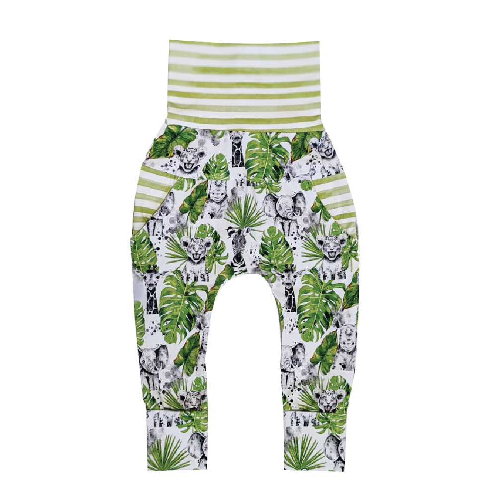 Safari print evolving pants. Harem pants cut with adjustable scalable bands at the waist and ankles. A loose fit perfect for layers or even without. Give your mini a casual style that will allow it to move easily.