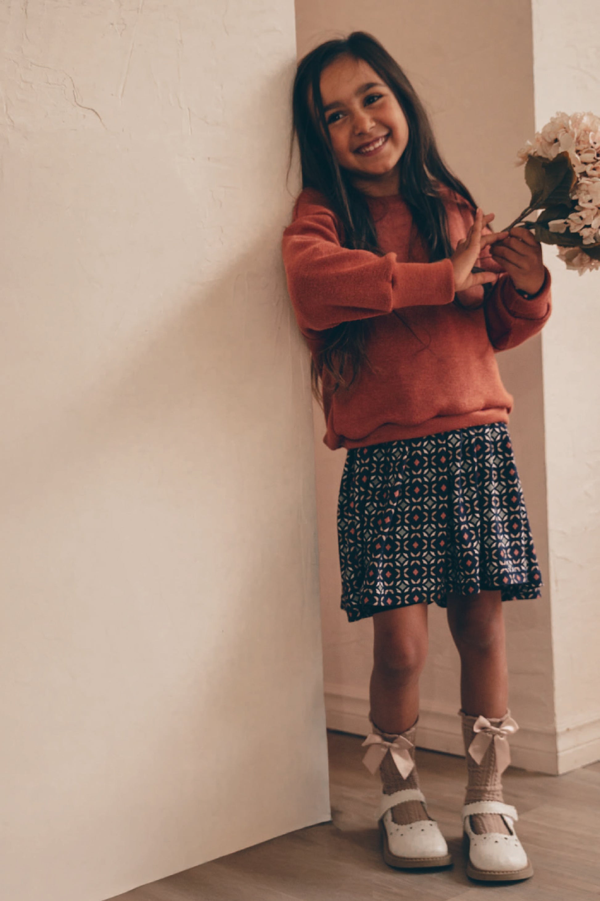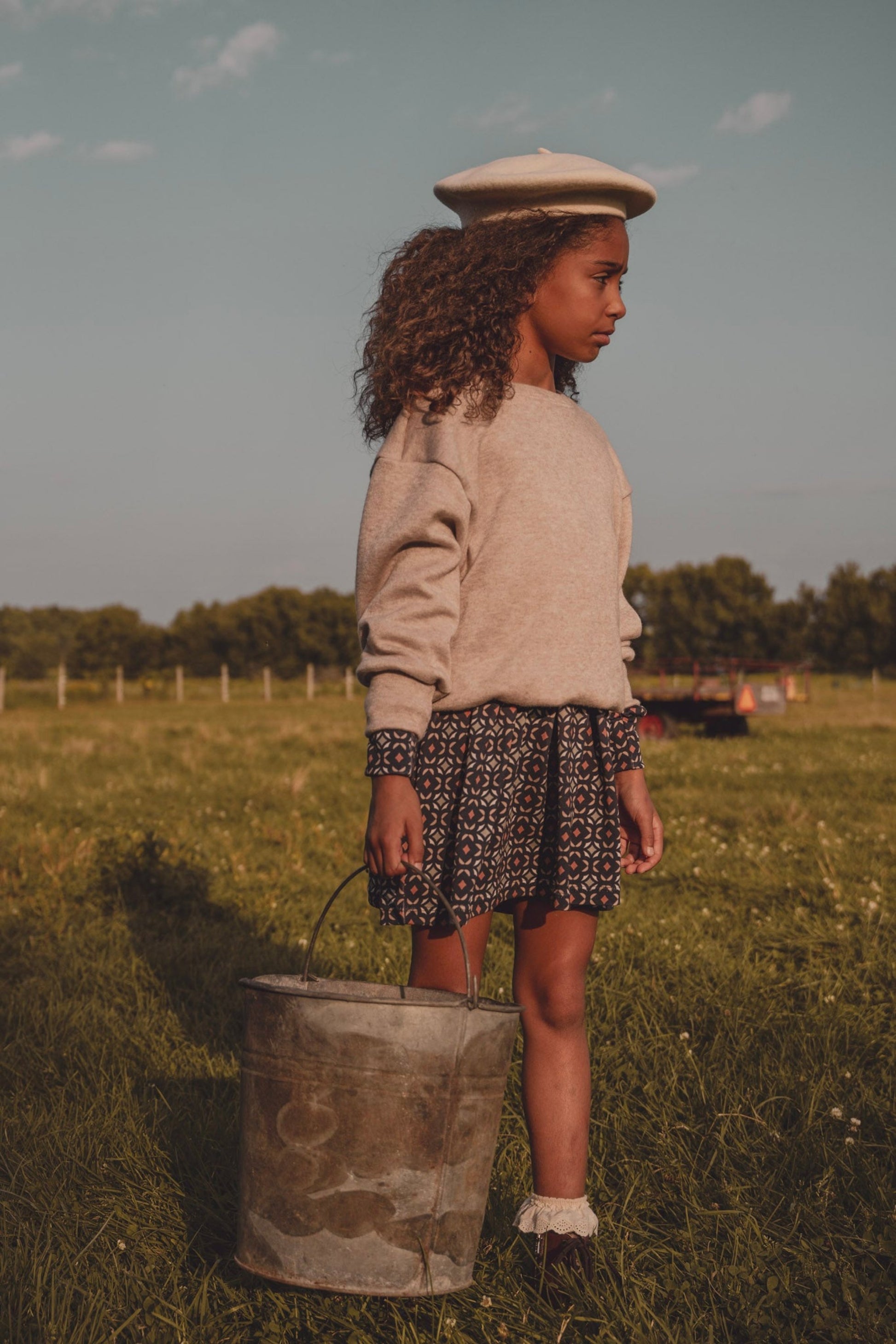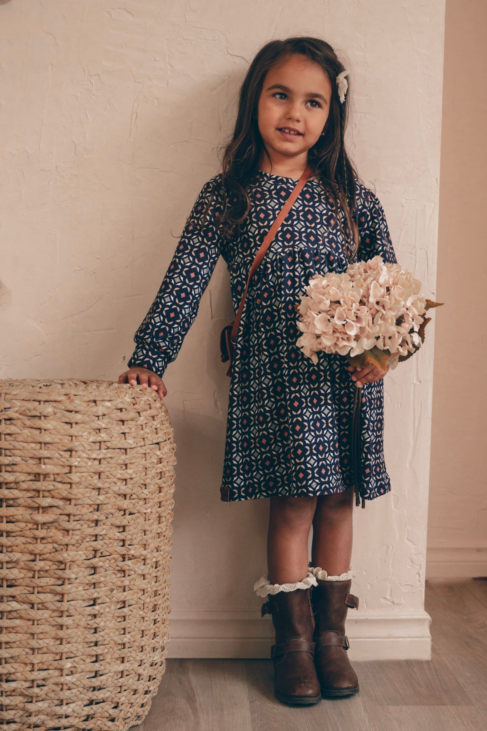 In harmony with the environment with its dull autumnal colors and its “peasant chic” style. Pair it with one of our bamboo ribbed basics or the new sweaters to stay warm. With its loose cut and the softest material, this dress will make your mini shine while giving it a boho-chic look.