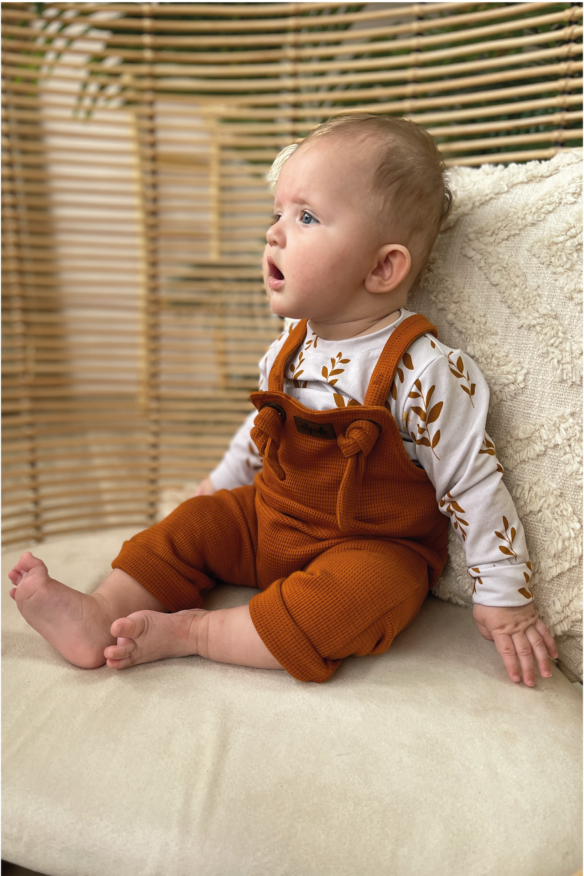 A favorite for this fall romper with its waffle texture giving it a unique style and its warm color! This charming romper will easily match with whatever you like. A loose fit that will allow your mini to move easily.