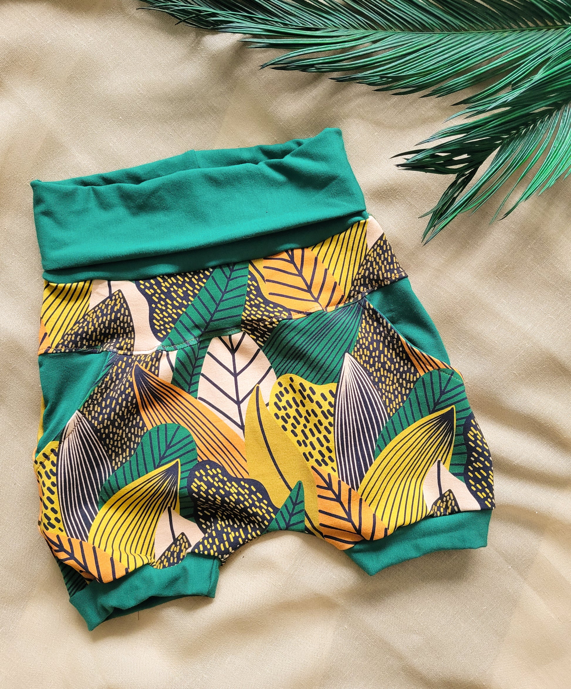 Harem cut shorts with adjustable adjustable waistbands, you just have to roll and unroll to adjust. Perfect for reusable diapers or even without to give your mini a casual style that will allow him to move easily. Equipped with real pockets.